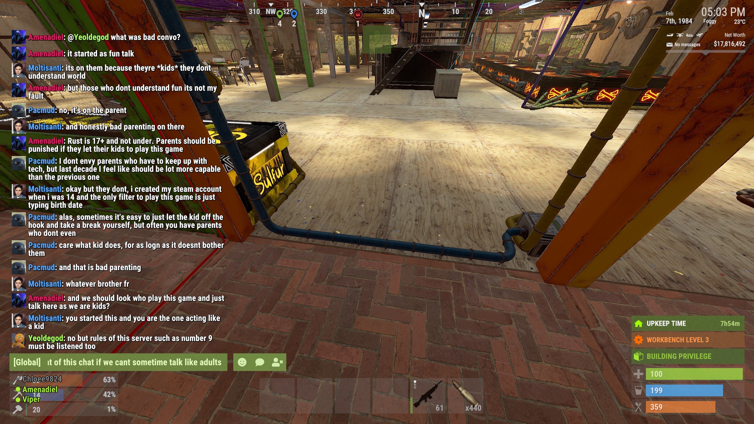 Didnt know that children under 14 was allowed to play on this server but there are some rules how people should or not should make jokes in chat because there are children who can read some "not appropriate words". And because of that i got banned from server from Cyberbunny. People if you want to chat look if Cyberbunny is online. if she is on just be nice or just dont write in chat cos she will see herself offended no matter what you write in chat and dont ask her for help cos it will be always against of server rules. Ask Yeoldegod he will always help. Good luck