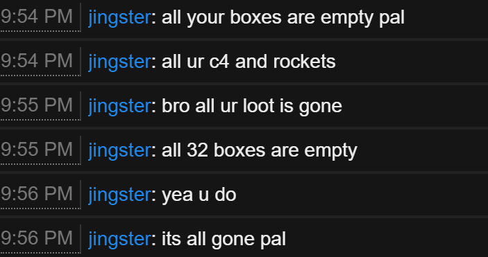 Offender: jingster Battlemetrics Steam Server: US PURE Time: 9:56 PM EST Length: permanent Reason: stealing/griefing Player spawned, met up with his accomplice and proceeded to crawl over any base they came across looking for ways in. They came across a base with an opening and went inside. Then they proceeded to steal loot from barrels, then jingster took the lock off the two cars in the garage, auth on the camper van beds, then proceeded to smash the cars in an attempt to steal them. Player warned for Stealing/Raiding/Griefing a second time after doing the same stuff inside the same base where they were previously warned. They resumed smashing up the cars there in an attempt to steal them. Player was kicked from the server with instructions to read the rules before re-joining to mitigate the destruction and was removed from the base. Player along with their teammate stole helis from other players and flew to another player's base where they looted a few things, but mostly despawned items. It was very apparent via global chat that they were not remorseful and had no intentions of following server rules. They have received a permanent ban.