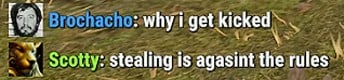 Offender: leecrimhood Server: AU Scourge Time: 6:30pm Length: Permanent Reason: Stealing and Griefing