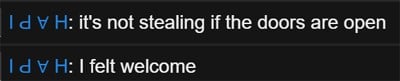 Offender: I Ԁ ∀ H Battle Metrics Steam Profile Server: (US)Pure Time: 9:18 PM EST. Length: Permanent Reason: Stealing/Raiding/Griefing. More Info (Optional): 12/12/2025 - I Ԁ ∀ H was warned for Stealing/Raiding after he entered another players base with an accomplice and stole everything in the base and from the sleepers there. These are just few samples from the mountain of evidence. 12/12/2025 - I Ԁ ∀ H was warned again for Stealing/Raiding after he and his accomplice entered another players base through an unlocked door and looted their box. As with everything he said in chat he was making light of his rule breaking and abuses against the the community. 12/12/2025 - I Ԁ ∀ H and his accomplice went to his neighbours base and killed their horse through their window. I Ԁ ∀ H had proven he had no intention of learning and following our rules or respecting the community so a permanent ban was issued.