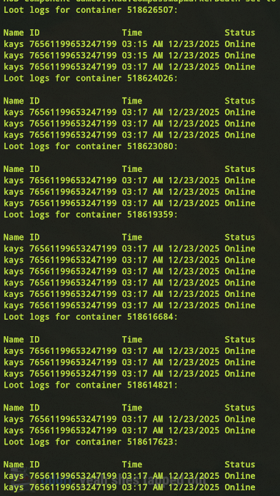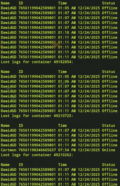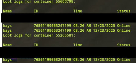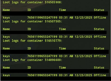 Offender: Browngioo Battlemetrics | Steam Server: EU Pure Time: 22/12/25 21:58:03 Expires: Permanent until appealed. Reason: Looting/Stealing More Info: The player received two warnings for violating server rules regarding looting. On 3rd Nov 2025, they raided a base and stole from a sleeping player, and on 22nd Nov 2025, they took items from a refinery at the airfield, refusing to return them even after being informed they belonged to another player. On 22nd Dec 2025, he once again looted multiple players and boxes. They were permanently banned for Looting/Stealing which violates the server rule: No raiding, griefing, or looting of any kind.