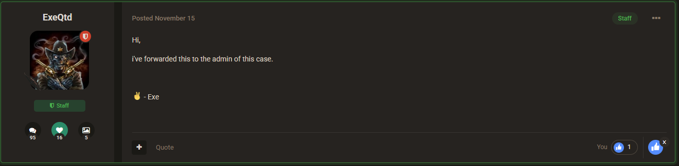 Hey EZ Admins I did a Forum last Month or so and was replayed with Hi, i've forwarded this to the admin of this case. - Exe By Exe. I just wanted to ask about it because i havent been replayed too since then. Merry Chrismas everyone and wish yall have a great new year.