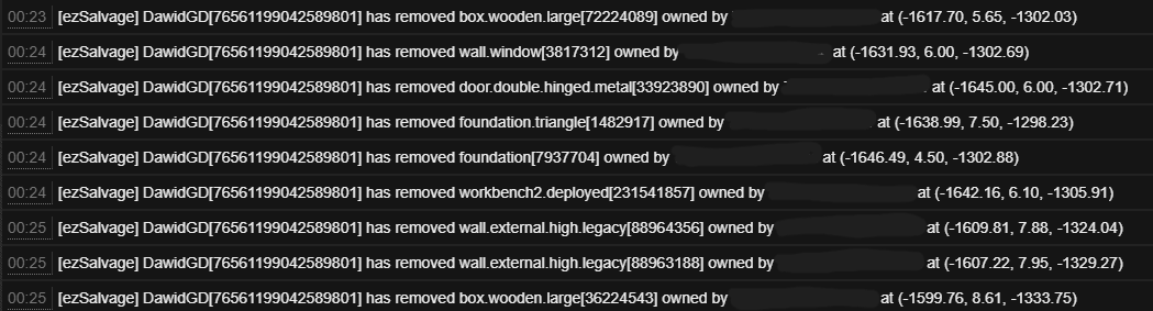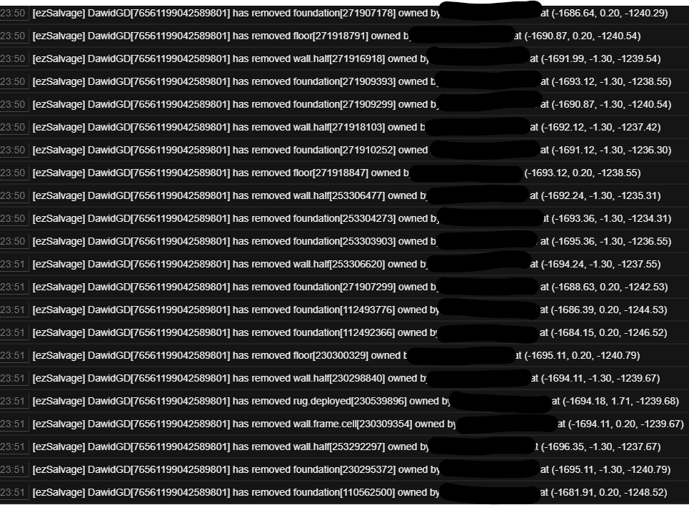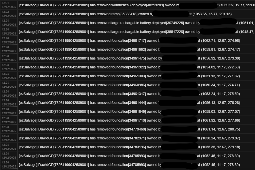 Offender: DawidGD Steam BM Server: EU Scourge Time: 19:33 GMT Length: Perm Reason: Griefing / Raiding / Looting More Info (Optional): Recieved a complaint of excessive land being claimed by TCs and high external walls running through many grids. Logged into the server to look into it and found ~600 high walls, ~200 spiked barricades and ~180 TCs spread through ~20 grids. Issued a warning for griefing and excessive land claiming. While looking into it, checked the players TCs to make sure the same behaviour hadn't been carried out in another location of the map without being reported yet, found several of the TCs belong to small 2x2 bases despite Dawid already having a heli tower, a main base and a farm base all spread out. Looking a bit further into the log revealed that Dawid had salvage raided at least 3 or 4 bases this wipe and the small bases were in fact raid bases in close proximity to the bases that had been salvaged. A further examination of the logs also revealed a number of TCs which Dawid was authed on that they did not own, all of these bases had a vulnerability, ie open windows / roof, chain link fence with an unlocked TC etc and at each of these locations I found Dawid ID on the containers inside. Walls/barricades/TCs removed as below. Further logs