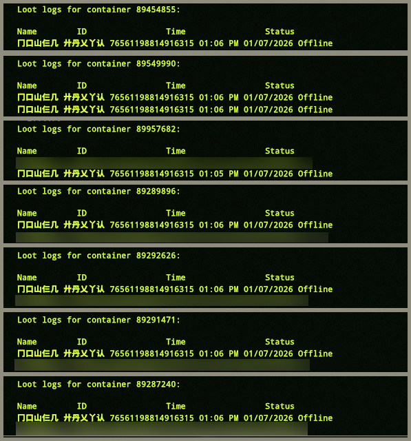 Offender: 冂口山仨几 廾丹乂丫认 Battle Metrics Steam Profile Server: (US)Pure Time: 12:36 AM Eastern. Length: Permanent Reason: Stealing/Raiding/Griefing. More Info (Optional): 01/10/2026 - 冂口山仨几 廾丹乂丫认 and his accomplice came onto the server and raided a lot of bases and looted many sleeping or DC'd players around the map. It was evident that what they couldn't steal they de-spawned, and destroyed vehicles/bases where they could. My first interaction with them was witnessing them enter a base and throw the compartments from multiple cars on the ground to de-spawn and then destroy the chassis. When I went to their base I discovered rows of boxes of stolen loot and not a single item had their names on it except for a building plan and wooden hammer to build their loot base. And they were only on for three and a half hours and had so many boxes of comps, raw and processed mats which would take players a week to obtain and process. It's vary rare to ban a player for a first offence unless that offense is so egregious that we determine that this players continued presence on the server poses a significant and even imminent threat to the community. It's so rare that in my time as admin this is the first time I've had to do it. Anyone who knows me knows that I am a strong advocate for giving players the chance to redeem themselves and turn it around, but based my experience if a player is willing to destroy items, bases and vehicles purely out of malice then that's their chosen style of gameplay and a permanent ban must be issued to protect the community and integrity of our server.