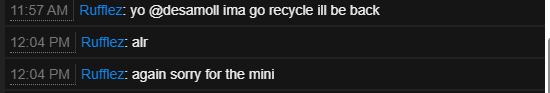 Offender: 12stat12 aka Rufflez Battlemetrics | Steam Server: US Pure Time: 2:43 PM EST Length: Permanent Reason: Stealing Rufflez warned after multiple reports of theft from players personal airdrops. The situation was mostly resolved between players, however Rufflez did keep some of the items rather than give them back, they were warned for stealing and advised of server rules. Rufflez warned for stealing another player's mini at dome and getting it stuck while attempting to fly off with it. A second and final warning was sent regarding stealing on our servers. Rufflez changed their name to 12stat12. 12stat12 joined shortly after wipe and it was not long until they began looting other player bodies. Given their previous warnings for stealing, a Permanent ban has been placed.
