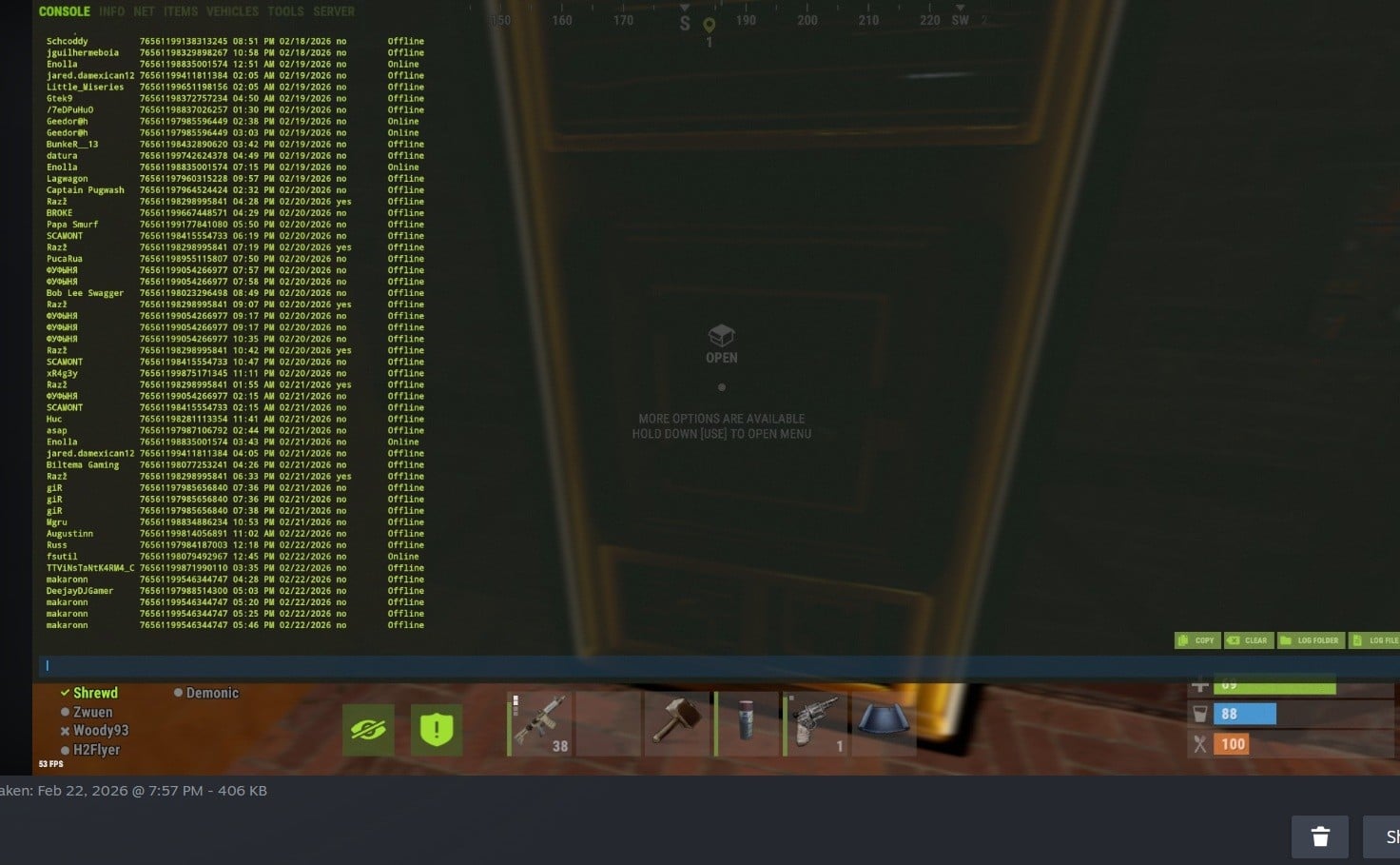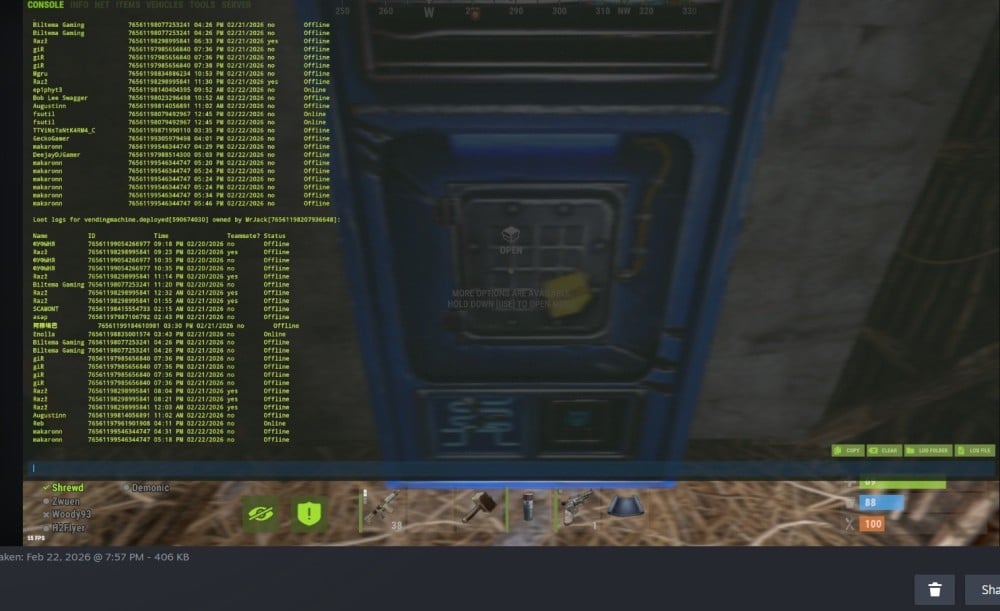 Offender: makaronn Battlemetrics | Steam Server: EU Pure Time: 22/02/26 19:47:38 Expires: Permanent until appealed. Reason: stealing and griefing More Info: The player stole stuff from a vending machine that belongs to the victim. When confronted, the rules were explained yet he kept griefing and asking question that clearly shows he is trolling. Then given another chance, the player ran again to the vending machine and stole more stuff and tried to run away. Obviously this player is not on the server to respect the rules. The ban was issued upon that.
