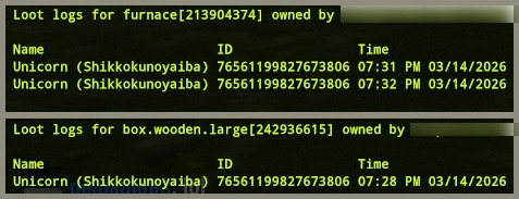 Offender: Unicorn (Shikkokunoyaiba) Battle Metrics Steam Profile Server: (US)Pure Time: 7:36 PM Eastern Length: Permanent Reason: Stealing/Raiding. More Info (Optional): Player hopped around Stealing on different RustEZ servers and had already received warnings from the admins on those servers. 02/13/2026 - Unicorn (Shikkokunoyaiba) was warned for Stealing after they ran around looting supply drops belonging to other player. 03/14/2026 - Unicorn (Shikkokunoyaiba) was warned a second time for Stealing after their name was discovered on container logs in another players base which was robbed. 03/14/2026 - I witnessed Unicorn (Shikkokunoyaiba) stealing from another players refinery. The logs support the victims account that moments before I arrived the player entered his base and stole from his box. The stolen items and materials were on his person and recovered. Unicorn (Shikkokunoyaiba) was warned for stealing multiple times and those warning explained that stealing is against our servers rules. They were also instructed to type /rules in chat to see what rules they must abide by on our servers. But despite all that he continued to steal so a permanent ban had to be issued. 03/14/2026