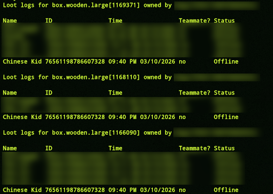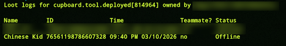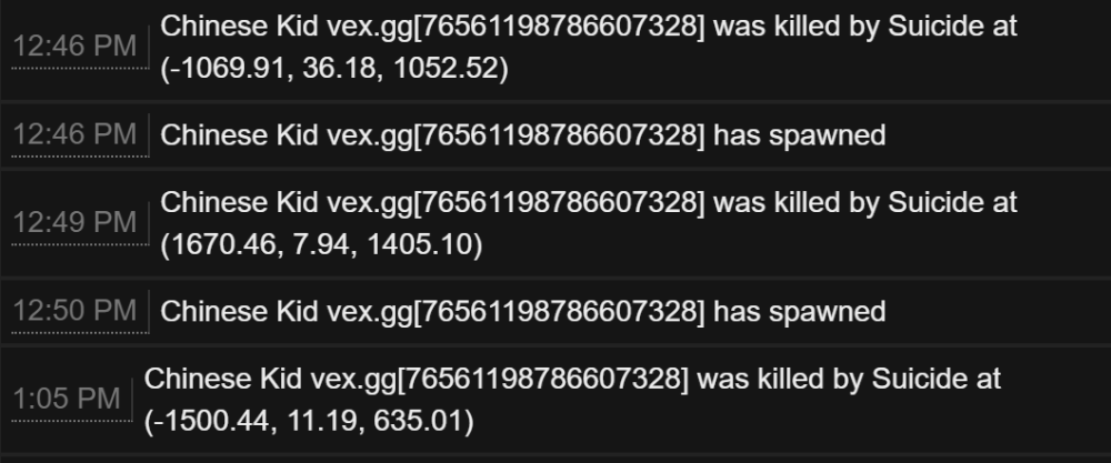 Offender: Chinese Kid Battlemetrics | Steam Server: US Pure Time: 5:42 PM EST Length: Permanent Reason: Stealing This player started out on our server as "Chinese Kid vex.gg" and has had several aliases along the way. They began their reign of terror by building onto other player bases to gain access to anything not tied down. Kid would suicide to despawn whatever they could. A formal warning was sent for stealing/raiding/grieifing. Kid then joined our server and decided to go for helicopters. They did not leave a body on the map and it was several days before they had logged on to get their second and final warning sent through. Kid's history on our server and general lack of wanting to follow the rules had them flagged as a risky player. Upon teleporting to them a mere 5 minutes after they had joined the server, they were already inside of someone's base helping themselves to anything not locked and protected. Chinese Kid received a permanent ban for their continued shenanigans.