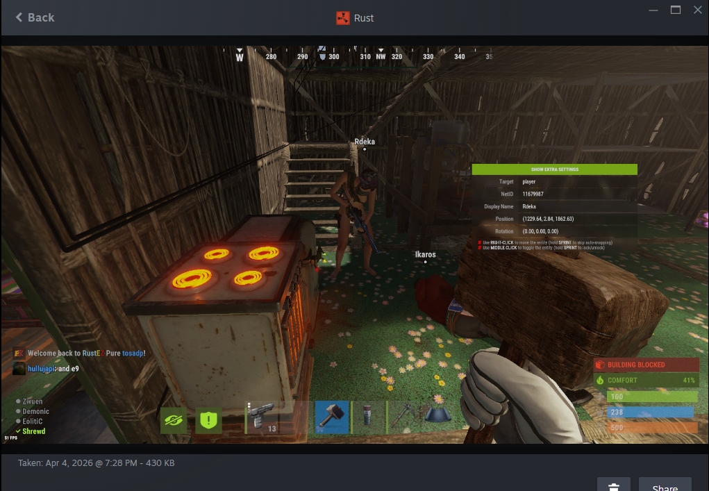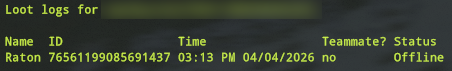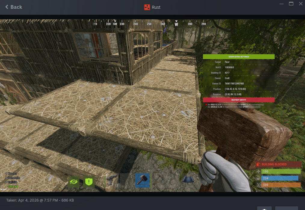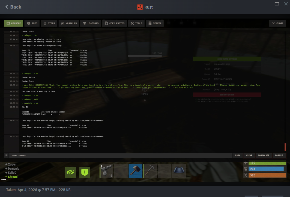 Offender: Rdeka Battlemetrics | Steam Server: EU Pure Time: 04/04/26 19:27:57 Expires: Permanent until appealed. Reason: stealing/griefing More Info: The player kept griefing and stealing ignoring all the warnings I gave and the verbal ones as well. Obviously the player is not here to stick by the rules. The ban was issued upon that.