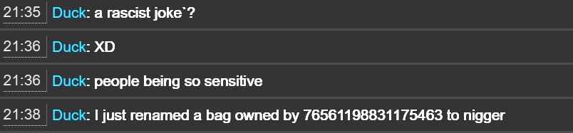 Hello, thank you for your appeal. After reviewing your case, obviously it was intentional what you did, using a racist word on a sleeping bag that did not belong to you. Regardless of intent or context, this type of language is strictly prohibited on our servers. Also, acknowledging in chat that such behavior could lead to a ban specially after you had a chat with the player Soa and knew what happened with him, yet you proceeded with the act. We also do not accept attempts to justify this behavior by suggesting others are being overly sensitive when you mentioned it in the chat. For these reasons the ban will remain in place. However you may submit another appeal after a reasonable period of time. - Shrewd
