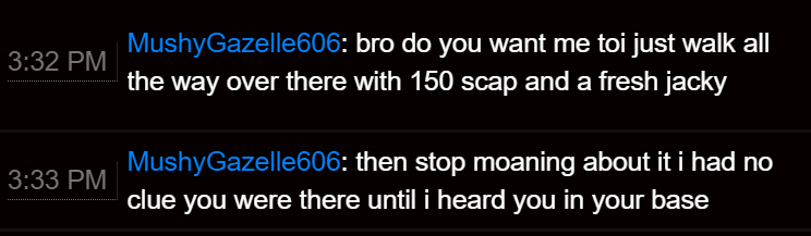 Offender: Teamwor Battlemetrics | Steam Server: AU Pure Time: 14/04/2026 09:54 AM AEST Expires: Permanent Reason: Stealing Teamwor was advised not to steal from players earlier today. They then progressed to raiding, griefing, stealing, de-spawning of loot and harassing other players.
