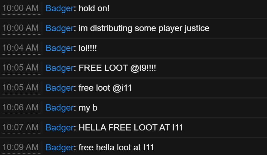 Offender: (GER)Tytrex Battlemetrics | Steam Server: EU Pure Time: 13/04/26 18:56:38 Expires: Permanent until appealed. Reason: Griefing More Info: Player logged in and started griefing. Raided a base and looted every box/furnace/entity possible and throwing it on the ground to despawn. Even wasted alot of resources from the victim by crafting random things. .