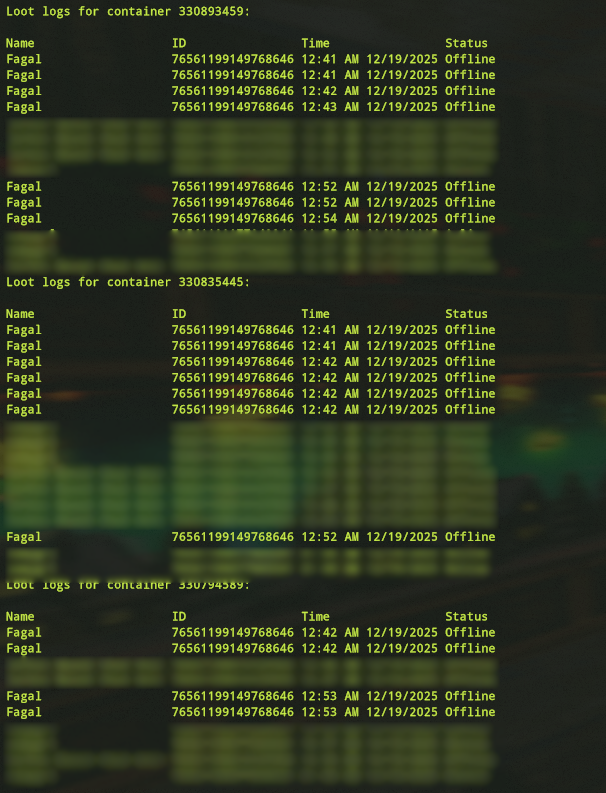 Fagal returned to the base and cleared as many boxes as they could again, only to run outside and drop items in a bush to despawn.  At that point Fagal was given a second and final warning. I no sooner than began putting the players items back when Fagal returned entering through another window and attempted to loot more of the players items.  They were given a permanent ban as it was clear they were never going to follow our server rules.