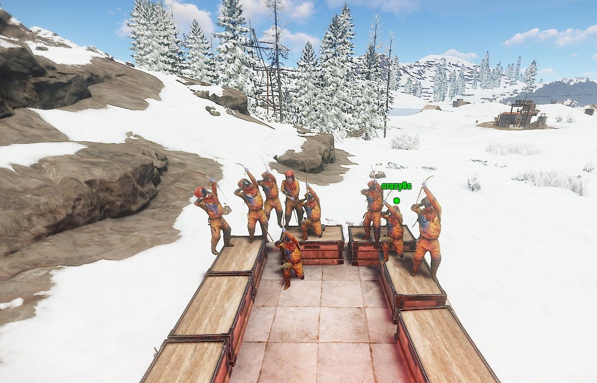 Equipped with bows, arrows, salvaged ice picks and eoka pistols, this group of 10 took military tunnels by storm! Three hours later the group finally disbanded after an evening of fighting heli, brad, zombies and bears. It was just another Saturday night on the EZ Scourge server. ;)
