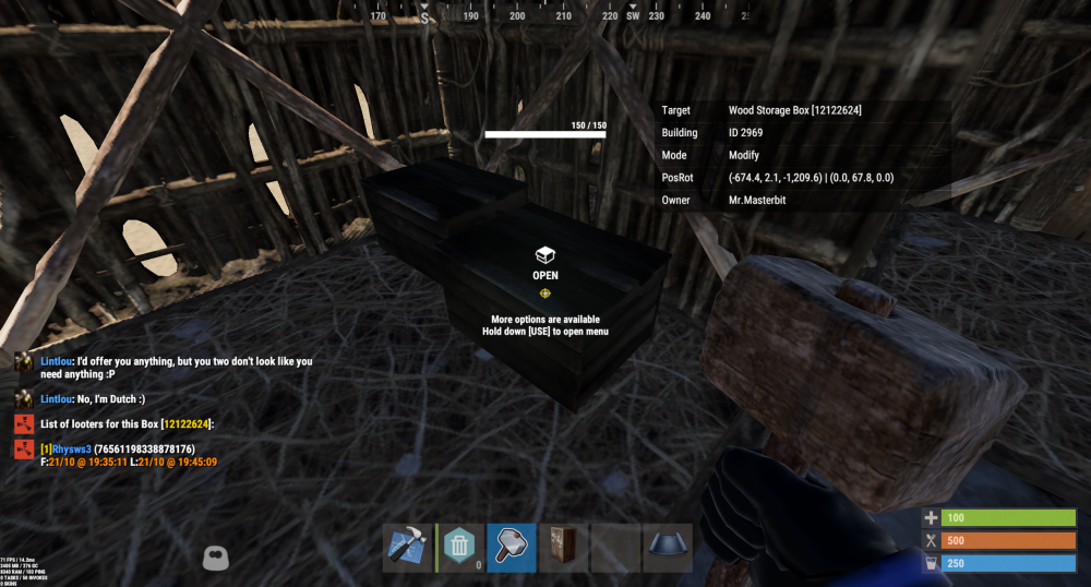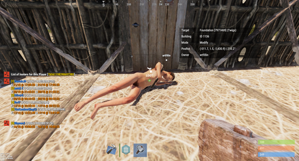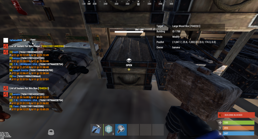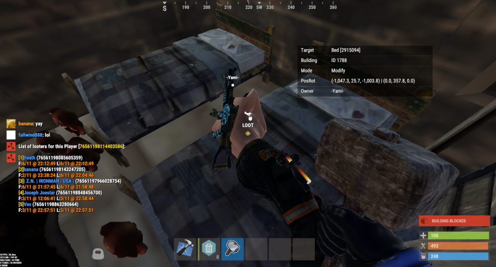 6. Offender: | Z.N. | IRONMAN | USA | (76561197966028754) (694013017) Time: 11:15pm EST Length: Permanent Reason: Stealing/Looting - Player entered another person(s) base and stole all they could, dropping the rest on the ground to despawn. Proof: