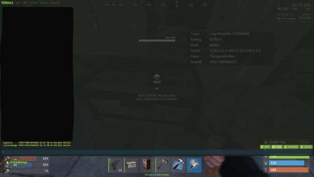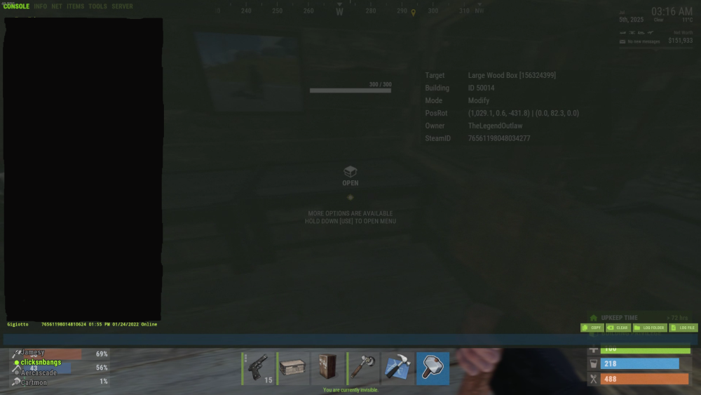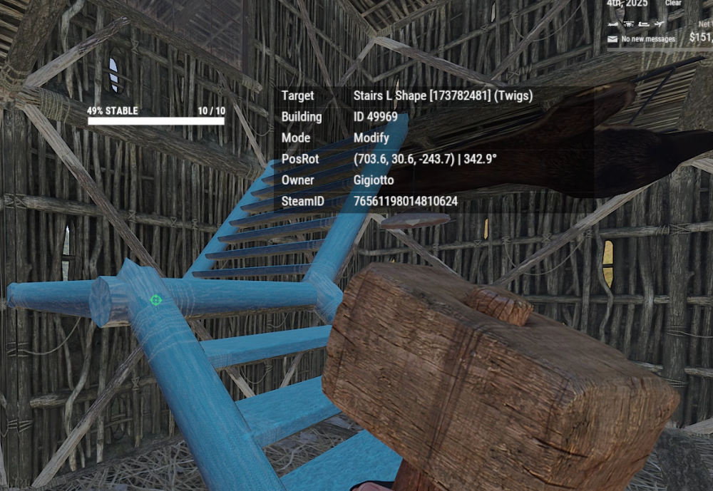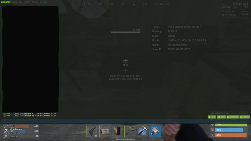 Offender: Gigiotto Battlemetrics Steam Server: EU Scourge Time: 15:55 Length: Permanent Reason: Raiding/Looting More Info (Optional): Gigiotto was reported in chat as other players had discovered him inside a base which didn't belong to him. On inspection there was a wall either removed or destroyed, he had placed his own TC inside and had looted a number of boxes and had also left various loot items on the ground despawning. At that point I sent an F1 warn command to tell him that kind of behaviour is unacceptable and to please read the rules using /rules. I decided to follow up the warn by speaking to the player in game to make sure he understood the message as I had noticed on BM that he is Italian. During my conversation with him it was revealed he had also raided a further 4 bases. He did say sorry but he also said it was too easy to get into players bases and inferred it was their fault that they had been raided. while I was investigating the full extent of the damage caused by Gigiotto, his neighbour spoke to me to tell me he had helped Gigiotto out with some supplies when he first joined but had since been raided twice by him, one of those times half of his base had been destroyed. I confirmed Gigiotto had been inside the base as there had been a set of stairs placed with his name attached to them while hovering over it with the uber hammer. Another player who had been stolen from was online and had explained Gigiotto had somehow gained access, removed his TC and stolen a number of items including the boxes he had stored them in. The only evidence I could find of Gigiottis presence was a door frame that had been placed with his name/ID attached. The other players whose bases had been raided were all offline but I found his name on a couple of walls inside one of those bases along with his ID in the logs on a storage box. Gigiotto also admitted to raiding a base and upon viewing it I discovered all that remained were just a few foundations and a sleeper, I can only assume the rest had decayed as the TCs Gigiotto was placing in other bases were not being fed materials for upkeep. Due to the sheer scale of the serious damage caused and loot lost and seeing that the player hadn't taken full responsibility for his actions instead placing it on his victims for not doing enough to prevent him, I decided to escalate his warn straight to a ban. 14:17 Gigiotto: a wall near elicopter was broken 14:17 Gigiotto: and i enter here 14:18 Gigiotto: there is a mount of bases built with a basic wood and it's easy to broke it 14:33 Gigiotto: it's too easy to broke 15:14 Gigiotto: i take a loot from a base, and i think the guy here was a cheater Despite the fact I told him in his warn that if it doesn't belong to him then he should leave it alone he still didn't understand 14:52 Gigiotto: if i found abbandoned bases can i take the stuff from it?