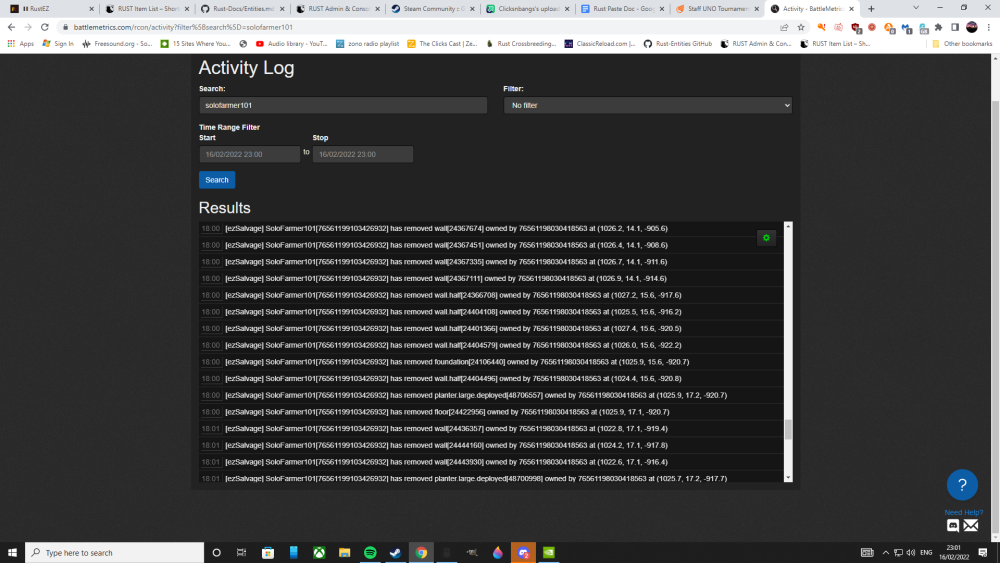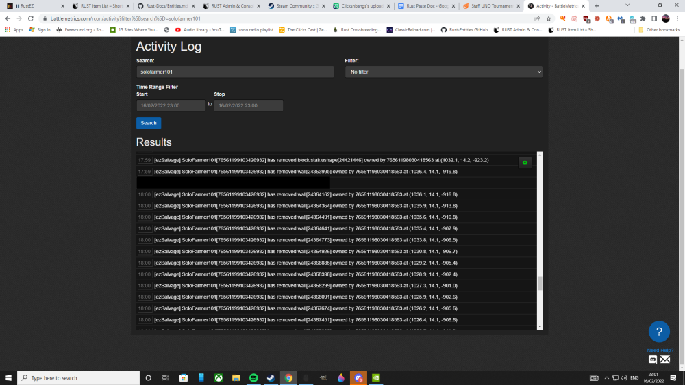 Offender: SoloFarmer101 Battlemetrics Steam Server: EU Scourge Time: 23:05 GMT Length: Permanent Reason: Griefing More Info (Optional): SoloFarmer101 was accepted into the team of an already well established player, who had a base, farm and heli tower as well as assorted loot, end game items and Rustez store bought items. SoloFarmer101 decided to take it upon themselves to use a salvaged hammer to remove all 3 of the other players buildings leaving only the foundations, despawning all the loot along the way.