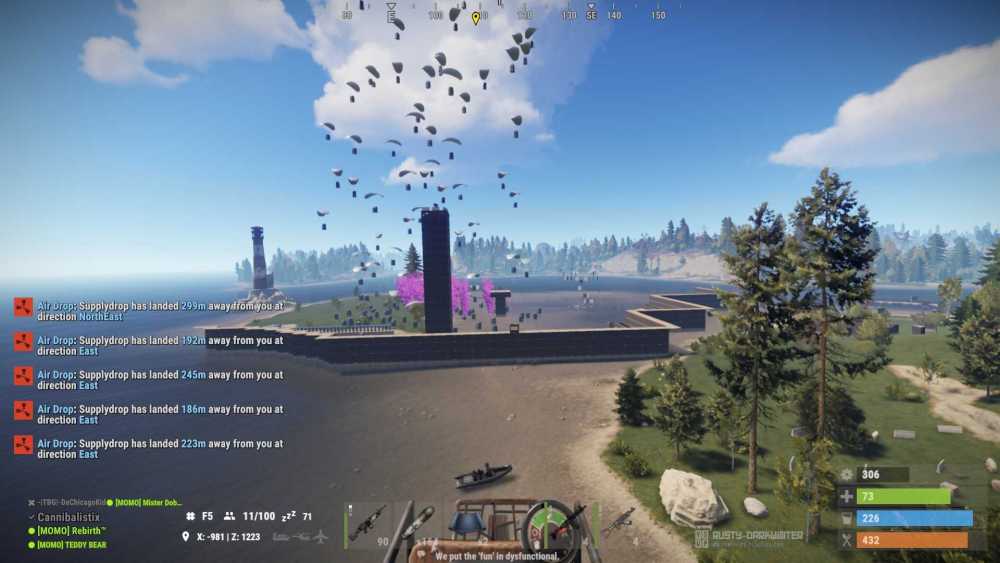 1) Poor guy tried to dive bomb on to my roof to avoid SAMs 2) Admin messed up loot tables, each supply drop gave you 2-3 more signals 3) A relaxing foundation wipe