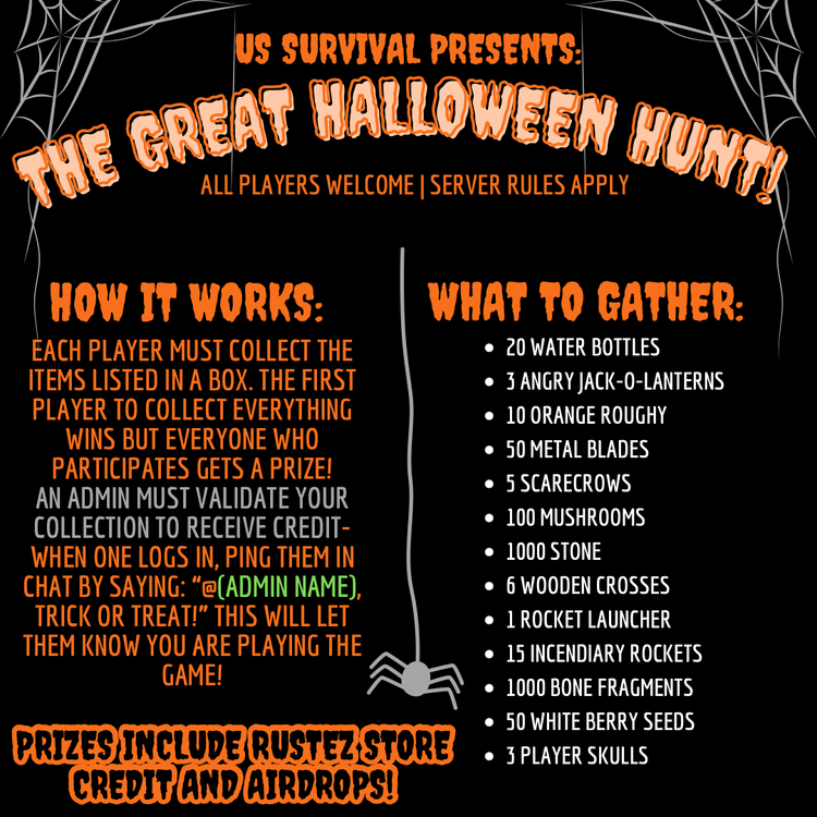 It's the most wonderful time of the year! Get your search on and collect some loot to win a prize on US Survival for the GREAT HALLOWEEN HUNT! This is a self-paced scavenger hunt event so it lasts all wipe long! Each participating player will get an airdrop for completing the hunt. Your task is to collect the following items: 20 water bottles 3 Angry Jack-o-Lanterns 10 ORANGE ROUGHY 50 metal blades 5 scarecrows 100 MUSHROOMS 1000 stone 6 wooden crosses 1 rocket launcher 15 incendiary rockets 1000 bone fragments 50 WHITE BERRY seeds 3 player skulls First 3 players to complete will win a little something extra: 1st place - $10 EZ credit 2nd place - $5 EZ credit 3rd place - 3 airdrops Tag an admin who is online in chat to enter once you have collected all your items! All players welcome and as always, server rules apply! **This event ends on 11/1/23** See you around US Survival! Happy Haunting - I mean, Hunting!