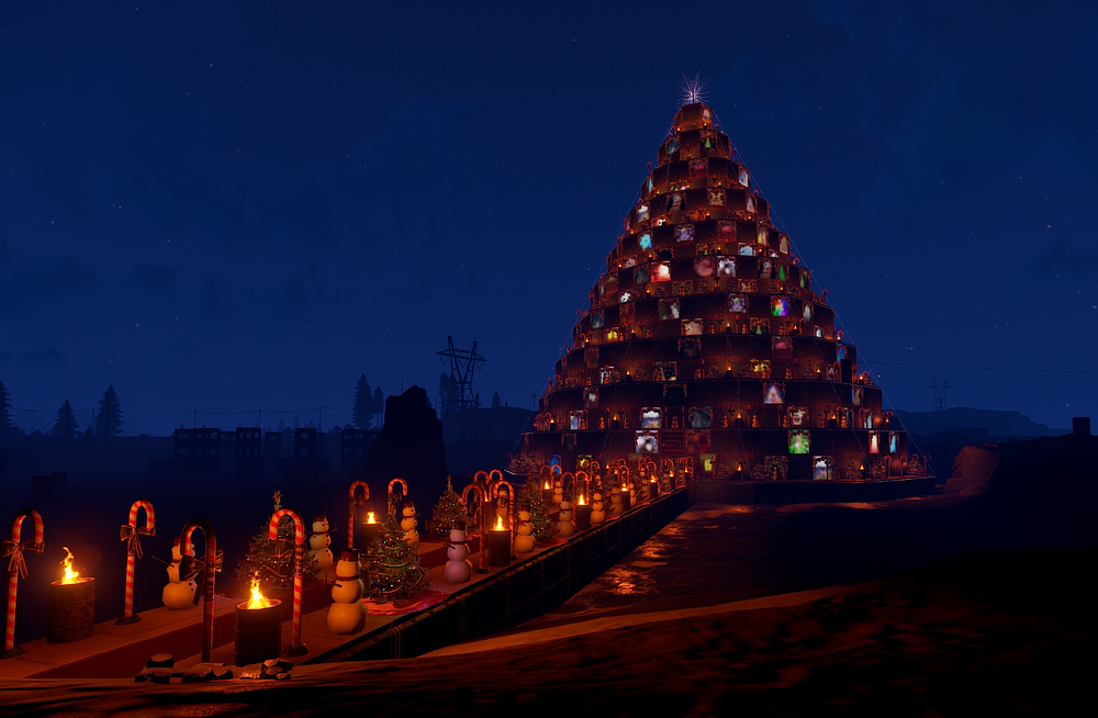 Ho ho ho everyone! We are inviting you to visit the RustEZ (AU) Scourge server to see our 20 story Christmas tree and multi-level decorated Christmas maze that starts on the ground floor and finishes at the top!  Head over to (AU) Scourge at grid S5|T5 on the frozen lake to take a look at this festive spectacle!  There might even be a special bonus guest there for you to see when you enter
