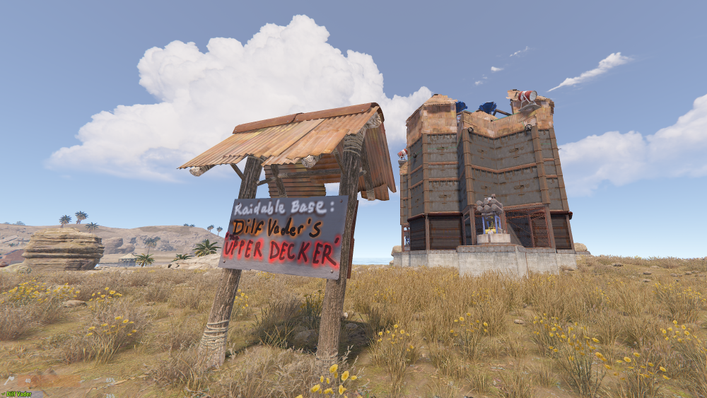(US) Survival, location: C5, ign: Dilf Vader, "The UpperDecker" If I'm not there for the tours, it's a little bit of a maze with 9 total auto turrets, 6 flame traps, and I think 15 shotgun traps. Sprinklers on exterior in case it spawns in the snow. All the seemingly extra floor frames are intentional, to prevent raiders from placing twig floors that would block traps Server issues have prevented me from hooking up the electrics: HBHF placed around exterior would activate: opening the 9 lower level garage doors for the 3 turrets there (otherwise these can just be chainlink) and also the 3 fluid switches to the sprinklers (otherwise the fluid switches can be eliminated and the sprinklers just always on when water is available) auto night-light setup for the 3 spotlights & 3 siren lights pressure pad to open the 3 flame turret garage doors in 'the pit' Found out you can't place traps on the stupid little rock terrain spots, but the interior 'honeycomb' layer at the bottom should have 6 spikes and 3 metal barricades. If an admin is building, this could be honeycombed with walls and then foundations deleted in order to place the spikes/barricades. Ladders on exterior can be left off if you want raiders to have to bring their own. There are lots of empty door sockets but I wouldn't recommend adding too many more doors than are already placed; it's already too tempting to just pummel from the outside without the ability to add more foundations for honeycomb
