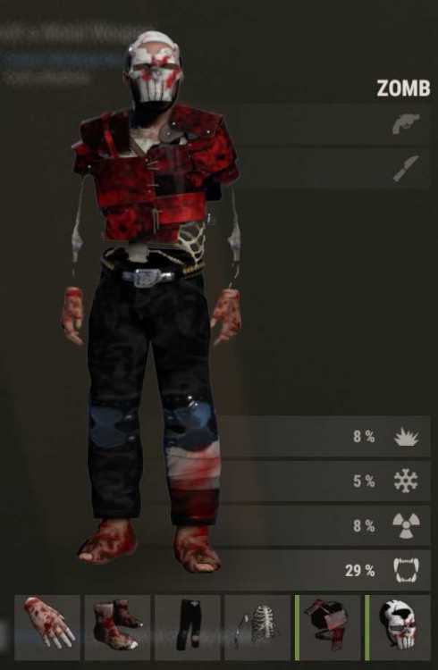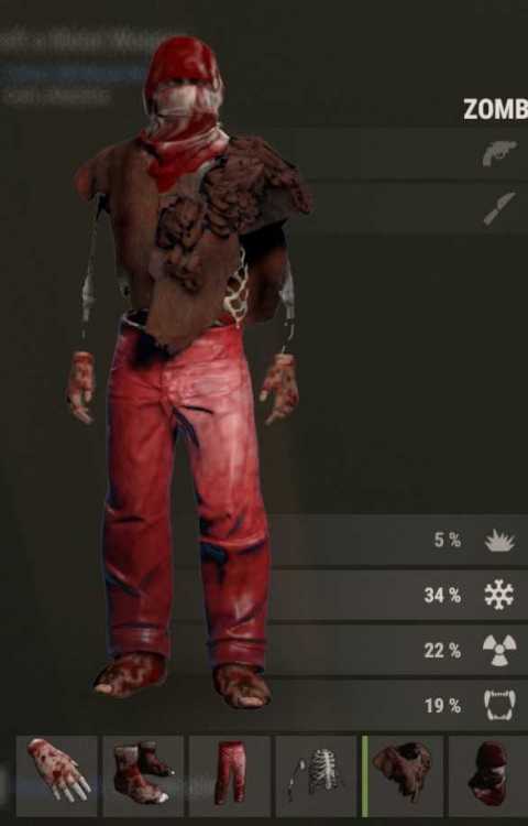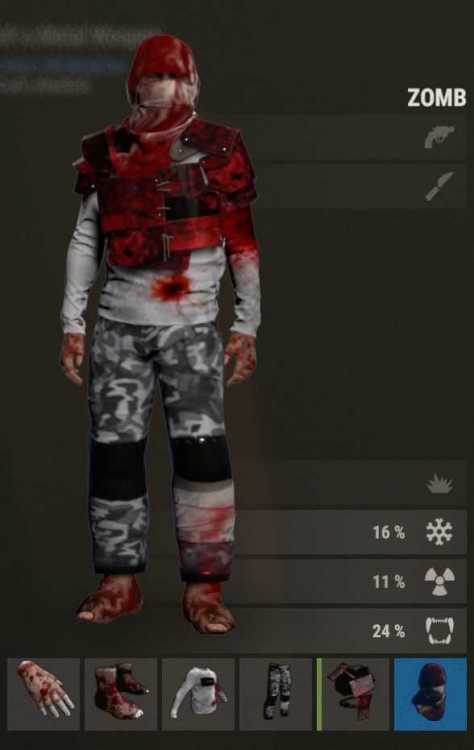 Zombie 1: Night Camo - Pants Red Dragon - Road Sign Chest plate Bone Armor - Shirt Skull punishing Mask - Heavy face mask Infected Feet - Burlap shoes Flesh Eating Bacteria Infected Hand - Leathers Gloves Zombie 2: Bloody Headwrap - Burlap Bloody Pants What's' That Hide? - Hide Poncho Infected Feet - Burlap shoes Flesh Eating Bacteria Infected Hand - Leathers Gloves Zombie 3: Bloody Headwrap - Burlap Infected Feet - Burlap shoes Flesh Eating Bacteria Infected Hand - Leathers Gloves I'm Fine - Long Sleeve Shirt Injured Snow Camo - Burlap Pants All From Skin Shop