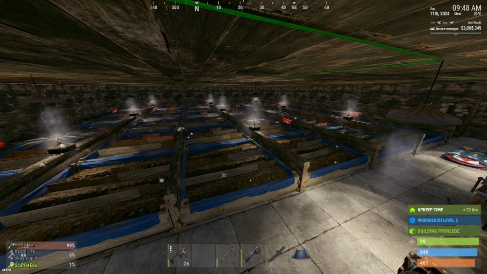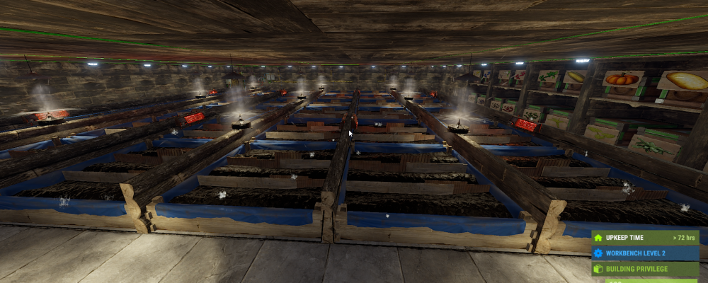Going to try this now, will post pics to see how it goes after I build it. I added a second pump as I have 36 beds (to allow for the extra 3 sprinklers). Works really, really well! I also went with one wall high, rather than 1.5 walls as I usually do. You are right its really dark in there at night! I added some of the industrial lights around the edges so I can see to plant (I was missing some of the plant spots lol). The industrial lights are very low lag. Before the industrial lights: After adding the industrial lights (and fixing heater connections lol): All in all a great setup, will be using again 💖