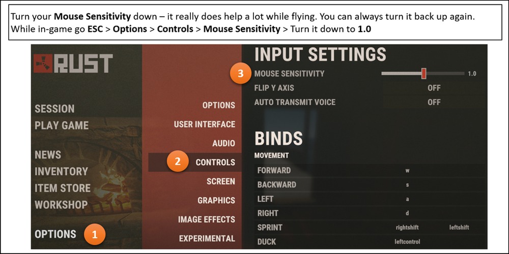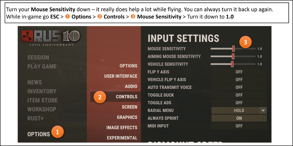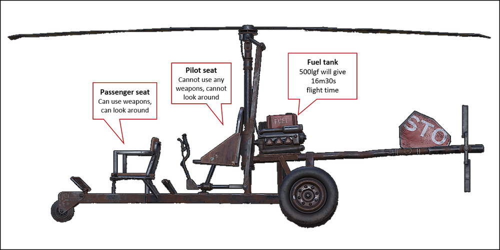 These tutorial images were from July 2019, there will be some changes from then. This is not definitive, its just a beginner guide to understand flying controls. Something that helps with vehicle control is turning mouse sensitivity down. [ESC > Options > Controls > Mouse Sensitivity ] Passenger: Can use weapons and look around. Pilot: Cannot use any weapons, cannot look around (in 2019 pilot could not look around, however they can now with CTRL). Flying uses WASD controls plus the mouse. To start flying, press W - this will start the mini-copter and move you vertically up. It also controls the speed of the mini-copter (makes it go faster). S - will slow the mini and move you vertically down. A - Rotates the mini left. D - Rotates the mini Right. Moving your mouse forward will tilt the nose of the mini down, it also helps move you forward. Move the mouse backwards a little, tilts the nose of the mini up. Nudge the mouse left a little, and it will tilt it in that direction. Nudge the mouse right a little, and it will tilt it in that direction. Hope this helps.
