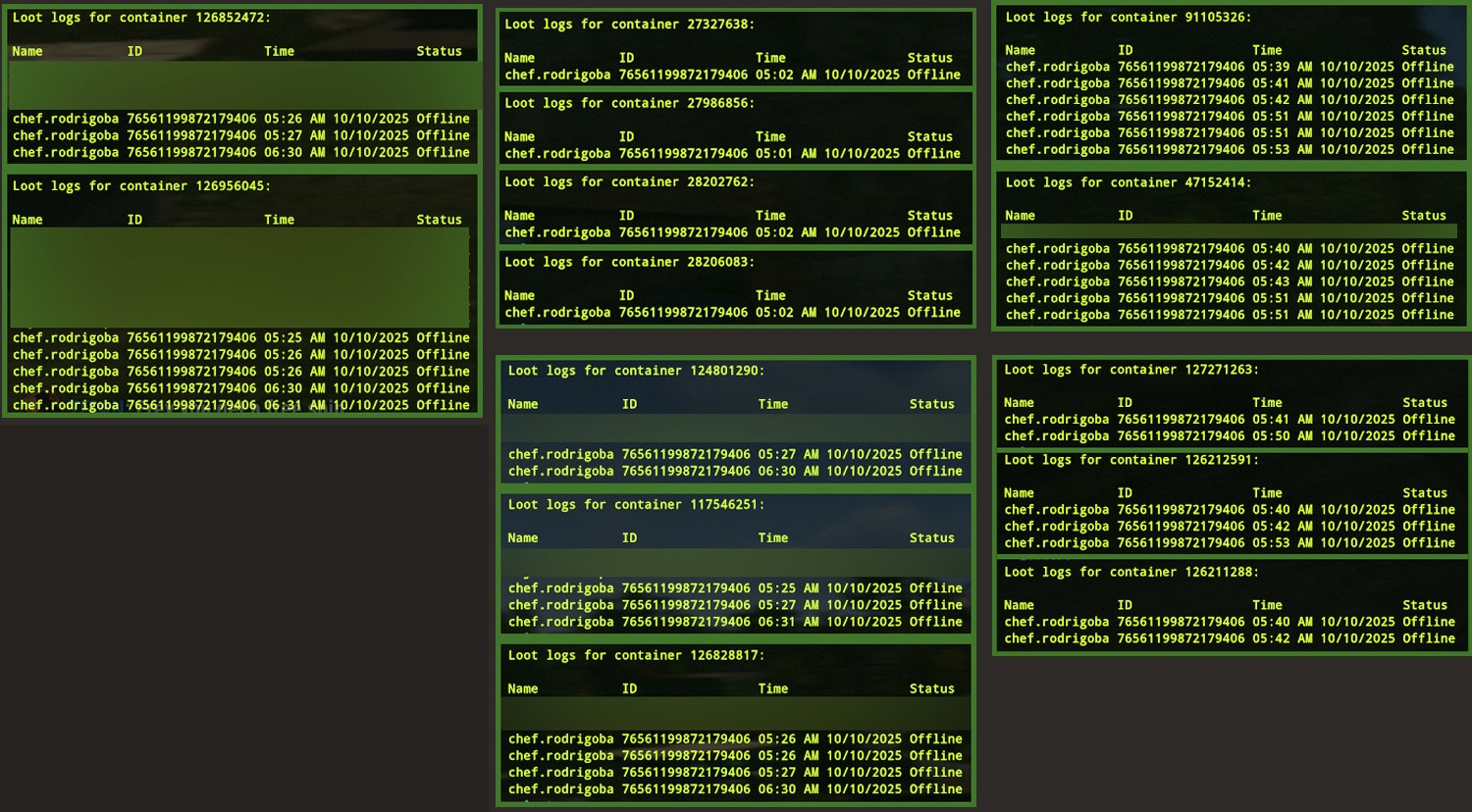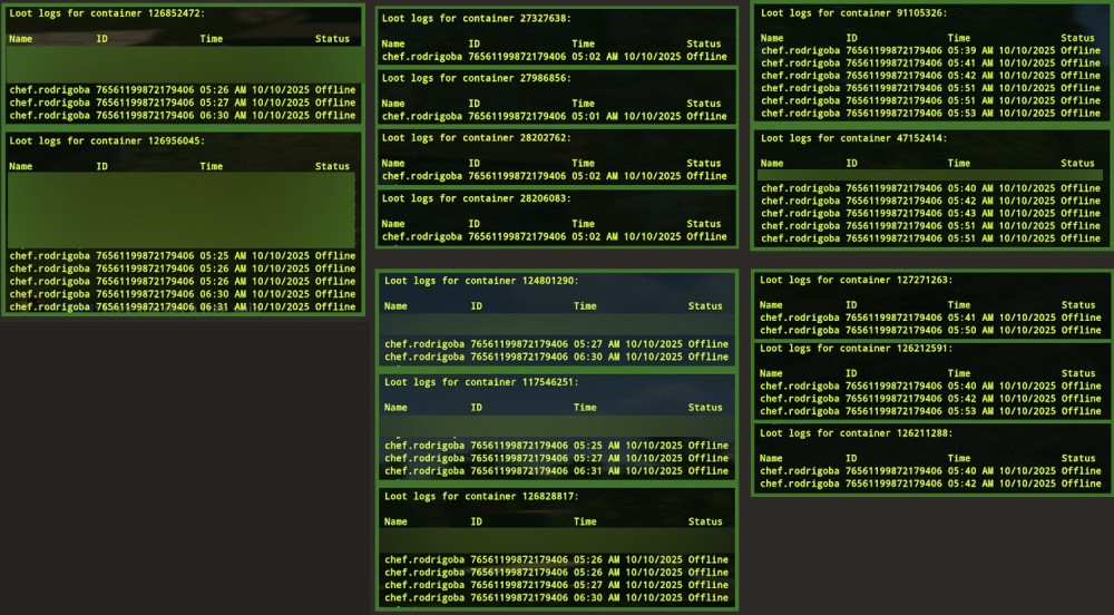 Offender: chef.rodrigoba Battle Metrics Steam Profile Server: (US)Pure Time: 8:11 AM Eastern. Length: Permanent Reason: Stealing/Griefing/Raiding. More Info (Optional): 9/15/2025 - chef.rodrigoba robbed a player and was sent a warning for stealing explaining that such activity is against the server rules. 10/10/2025 - chef.rodrigoba laddered into many bases and robbed everyone and everything he could find. Player hit quite a few bases robbing everyone and everything he could. Since it's clear he does not listen to warnings, and does not have any interest or intent to learn the rules, and considering that the scale of his violations has increased dramatically, i have decided I cannot justify the risk of allowing this player further opportunities to harm the community in such a way and to this scale again, so a permanent ban was issued. Just some of the evidence. El jugador se pasó varias bases robando todo lo que pudo. Dado que es evidente que no escucha las advertencias y no tiene ningún interés ni intención de aprender las reglas, y considerando que la magnitud de sus infracciones ha aumentado drásticamente, he decidido que no puedo justificar el riesgo de permitirle más oportunidades de perjudicar a la comunidad de esa manera y a esta escala, por lo que se le ha emitido una suspensión permanente.