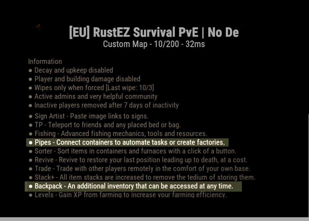 Nothing important but just thinking of you. i noticed on a survival load screen you have server features listed which at the time were unique features you offered which were not part of the offical game, like pipes and the backpack, but now those featues are part of the offical game and players will know they can expect those things, so listing them as specific server benefits appears as wierd. Maybe remove them for clean optics. 😉
