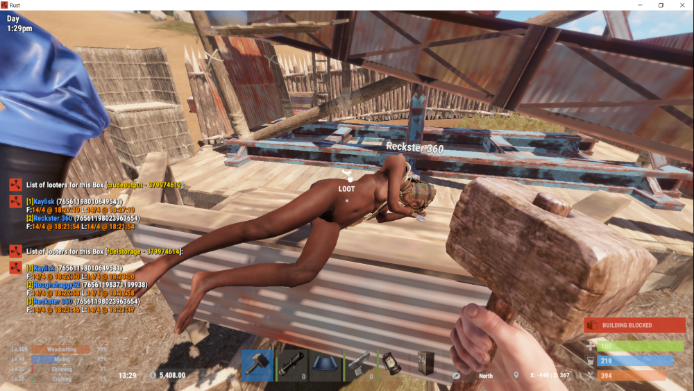 SteamID: 76561198023963654 Time: 2:38pm Eastern Time Reason: Looting/stealing Length: Permanent More info: I was watching Reckster 360, and his friend, Big MnM play newly on Survival PvE. Big MnM 360 then boosted Reckster into Majin's pumpjack compound, and as me and Roughshaggy confronted him, he dc'd with no explanation. So, we removed him from the server and compound