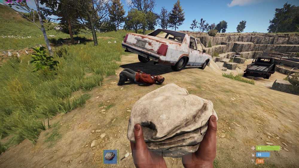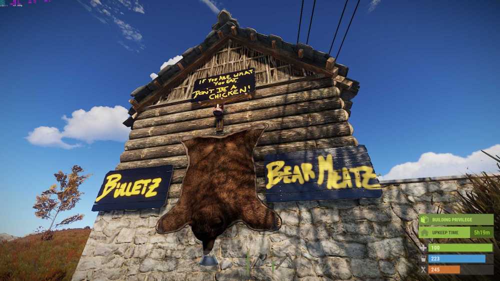 8. Oooh I love this. I keep meticulous screenshot histories of each Rust wipe. My first Rust screenshot is from about 3 months after I tried Rust in April 2018, when Vin Dizzle and I finally found RustEZ. We started on Pure. I had hopped out of my car while driving and promptly drove over myself. When I came back I nabbed a shot. Ah... I've warmed up to the new cars but this makes me nostalgic. Vin and I set up a shop that wipe called Bulletz and Bear Meatz. It did what it said on the tin. @Huddicle, who was an admin at the time tried to jump a river in a car and it ended predictably.