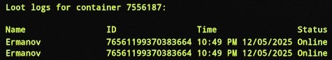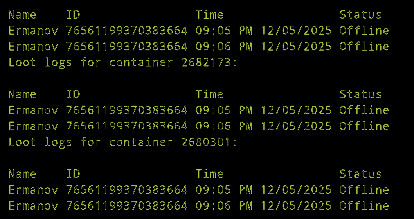 Offender: Ermanov Battlemetrics Steam Server: US Pure Time: 9:44 pm EST Length: Permanent Reason: Stealing Ermanov was warned for stealing items from another player's body bag after they had died. They were verbally talked to about server rules, and console warned. Ermanov was on the loot logs of another player's base that had items missing from vending machines and furnaces. A final warning was sent to the player stating that any further infractions would result in a permanent ban on our servers. Ermanov's received a permanent ban after laddering onto yet another base where they accessed unlocked items. It was clear that no amount of PSA's or chats about our rules, they did not intend to follow them.