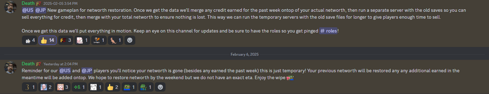1. I have my doubts that is what happened. The servers had a bit of an issue for the last week or so, and were put up temporarily with $1000 NW for everyone. As of earlier today, the servers have wiped and we are starting at 1000 NW (If you didn't play during the temp server). Once Death and the team are able to get the back ups running, they'll upload them to temp servers so players would be able to log on and sell their items from last wipe, then the NW from previous wipe and current will be combined.