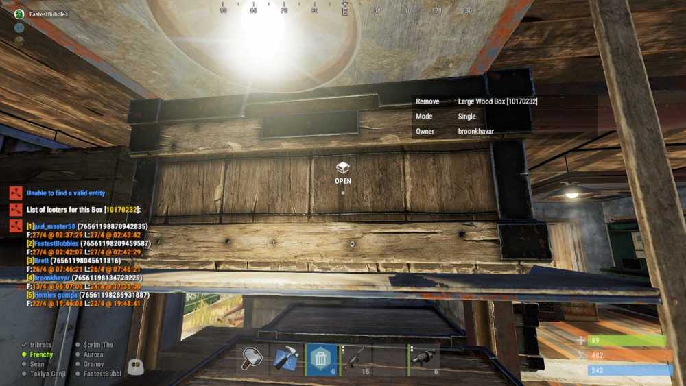 Offender: LDN14 (76561198007828007) Server: US Pure Time: 9:17 pm EST Reason: Raiding, Looting, despawning loot Info: Offender jumped into base, pulled out and despawned entire second floor of storage chests renamed bed. Upon reviewing BM, Offender has a pattern of the same behavior, never more than an hour on server at a time. Used f1 kill before every time he left the server, and never placed a base. Proof: Below