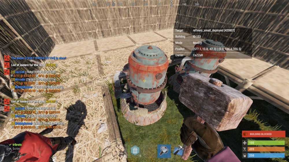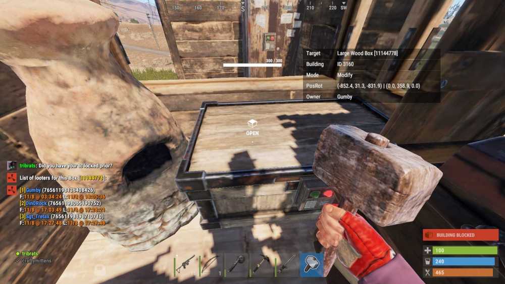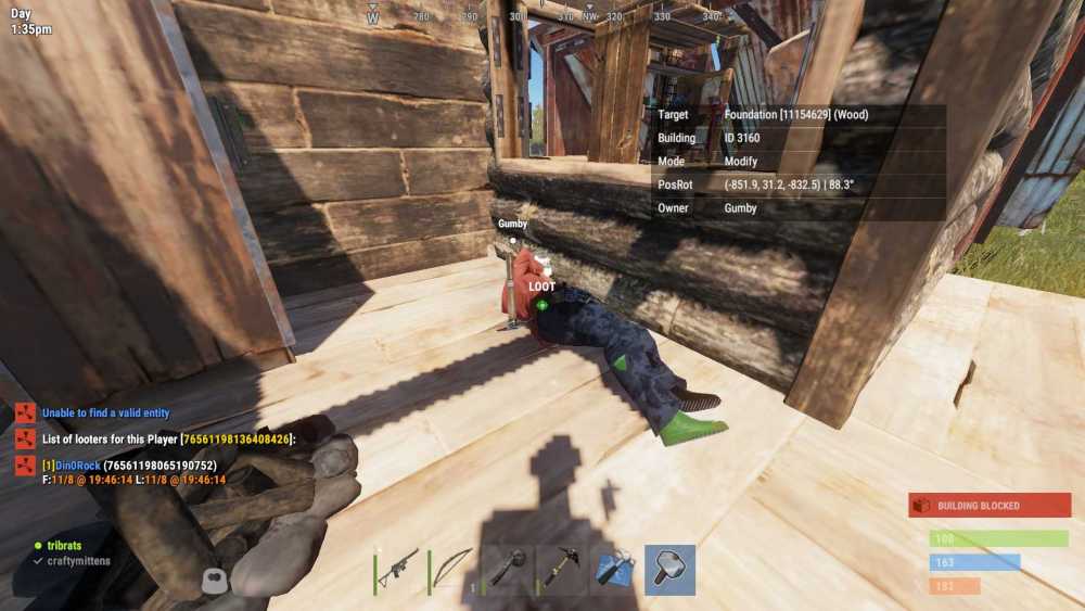 24. Time: 3:42 pm (est) Length: Permanent Reason: Raiding, looting, boosting Additional Info: Gumby informed me that he was raided. Sgt_Tretax and Din0Rock were on the loot logs. While I was observing them, they looted a body and cars in garages. They also attempted to boost into another player's base. The missing items were found in their base. More screenshots available upon request. Proof: