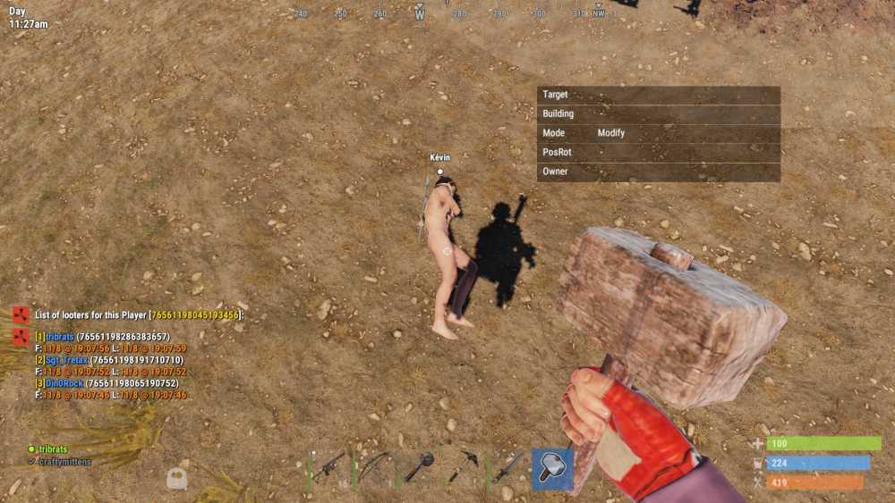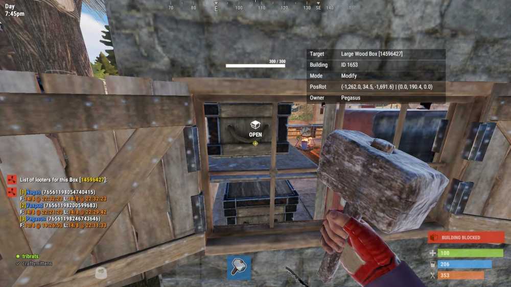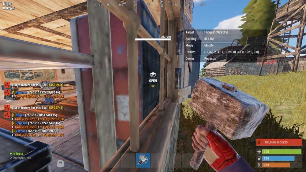 23. Time: 6:45 pm (est) Length: Permanent Reason: Raiding, harassment Additional Info: While I was passing by I saw Nagas at Pegasus' window. Upon checking, I found his name on one of her chests and fridge. Pegasus noticed items missing and said items were in Nagas' inventory. Vaxpud was also on the logs and the 3 were playing together. goleritougame started throwing items and harassing Pegasus after Nagas was banned. He was warned to leave her area and leave her alone. I observed him continuing to harass her after the warning. Even when I confronted him he continued while I was present. Proof: