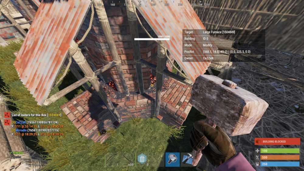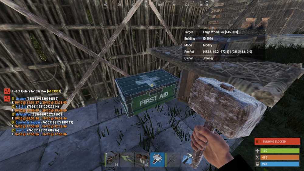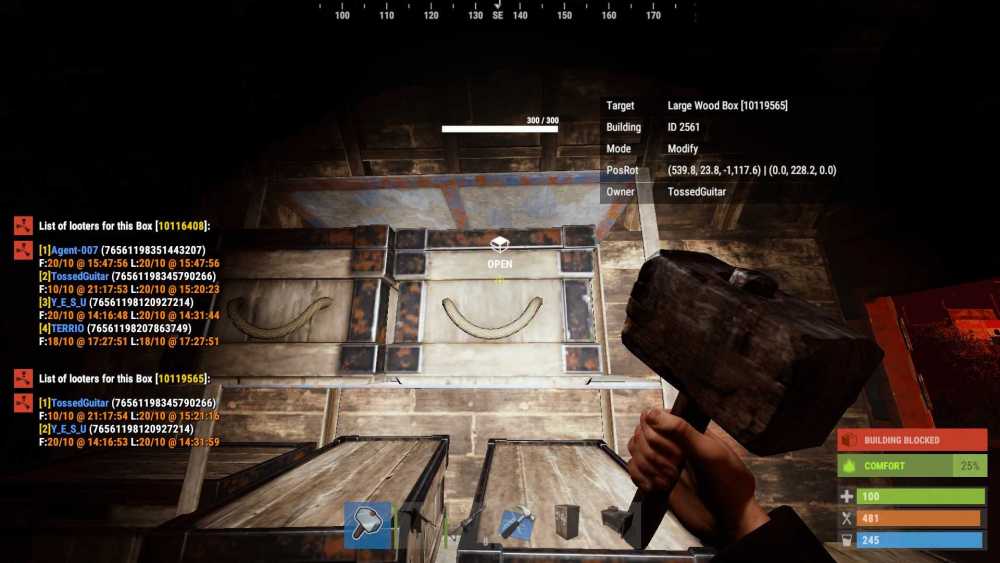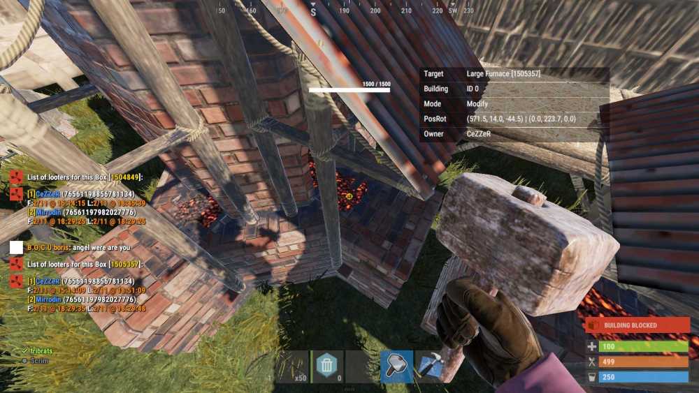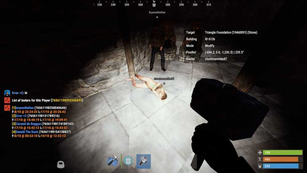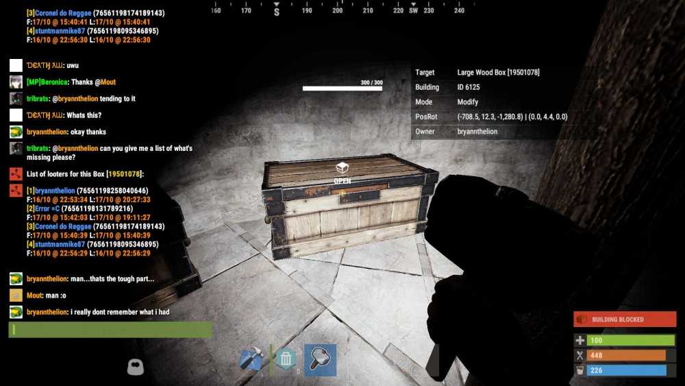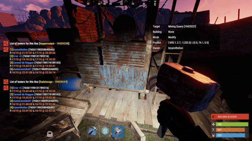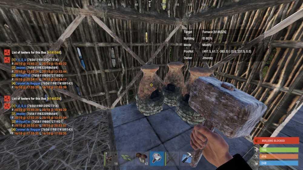 10. :Offender: Error =C (steam) (178592971) Offender: Coronel do Reggae (steam) (211712942) Time: 9:45 PM EST Length: Permanent Reason: Raiding, Looting, Boosting Additional Info: Both were boosted in by an unknown and looted a compound's chest, sleepers, furnaces, quarry, etc. They both authorized on the tc as well. Update, after initial ban, we found their names inside multiple other bases and the tc's in them. Additional proof upon request. Proof: (more available upon request)