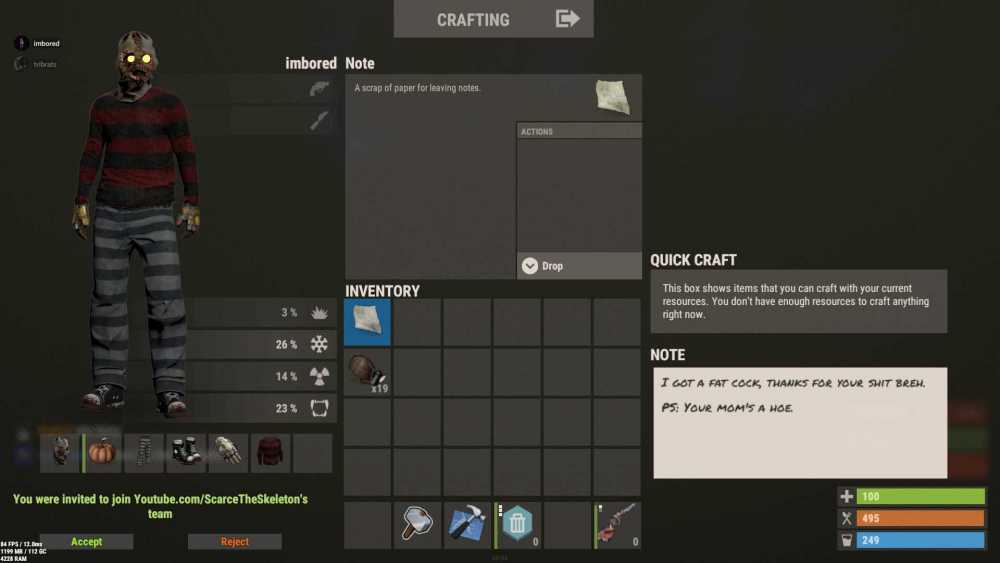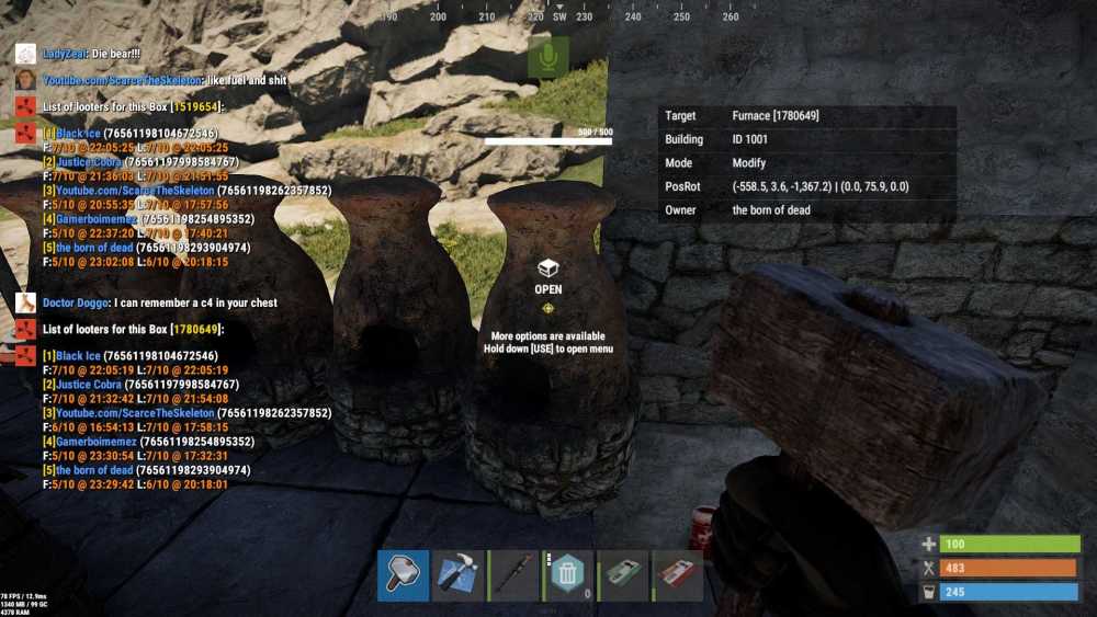 Additional Info: Players jumped through an opening on the 2nd floor by jumping from a boiler onto a sign, into a missing wall. They took literally everything they could out of the base and left a nasty note. Was very vulgar in voice chat to one of our admins prior to ban. More screenshots are available if needed.
