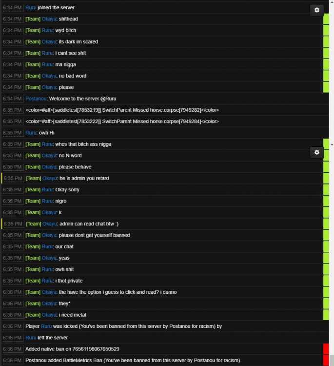 Offender: Ruru Meta Info: Steam BattleMetrics Server: AU Pure Time and Date: Sunday 13th March 2020 at 8:36am UTC Length: Permanent Reason: Racism Evidence: Used the N word in team chat. The question "whos that bitch ass N..." was referring to me.