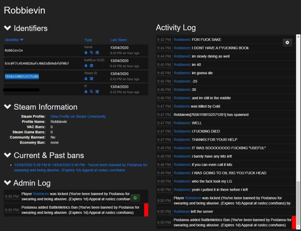 Offender: Robbievin BattleMetrics Steam Server: AU Pure Time: Monday 13th April 11:50am UTC Length: 1 day Reason: Constant swearing and abusive to other players. Has little experience with playing Rust, but insists on attempting end-game content like soloing oil rig. After his inevitable death and respawn, he becomes highly aggresive, and abusive, and expects others to drop everything and help him. He has been warned in game by admins (myself and Adman74) several times about swearing, including at least 1 kick. This particular incident was completely out of line, and he was horrid to another player verbally. See attached image of some of the disgusting diatride that is directed to fellow players.