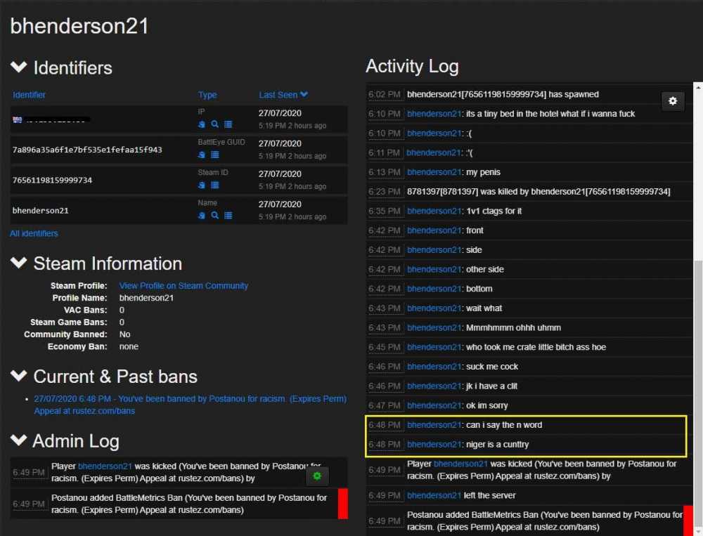 Offender: bhenderson21 BattleMetrics Steam Server: AU Survival Time: 27th July 2020 @ 8:49am UTC Length: Permanent Reason: Racism, with a bit of toxicity thrown in.