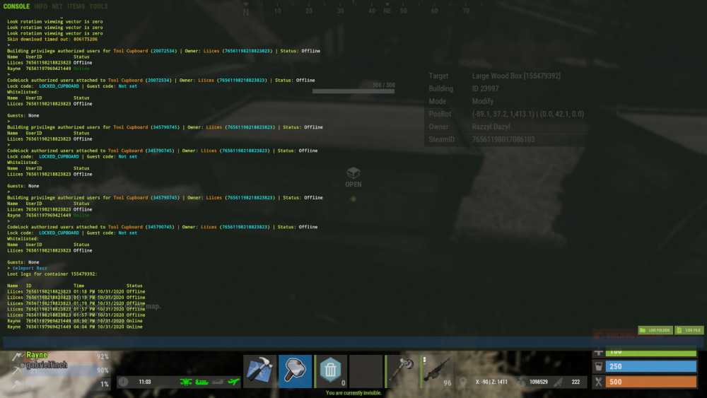 Offender: Liices Steam ID: 76561198218823823 Server: US Survival Length: Permanent Reason: Raiding More Info: Player was found to have taken from 3 players over the course of this wipe (October 2020). Instance 1: 10:40 AM [ezSalvage] Liices[76561198218823823] has removed mining_quarry[5514103] owned by 76561198026601118 at (1732.8, -1.4, -1069.8) That ID belongs to PlsDntKillMe. Warning sent to Liices. Instance 2: [ezSalvage] Liices[76561198218823823] has removed refinery_small_deployed[13056790] owned by 76561197964420916 at (-589.0, 0.5, 1176.9) That ID belongs to Chiron Warning sent to Liices. Instance 3: Lices was seen in Looters in Razzyl Dazzyl's boxes. All of Razzyl's resources boxes had been emptied.