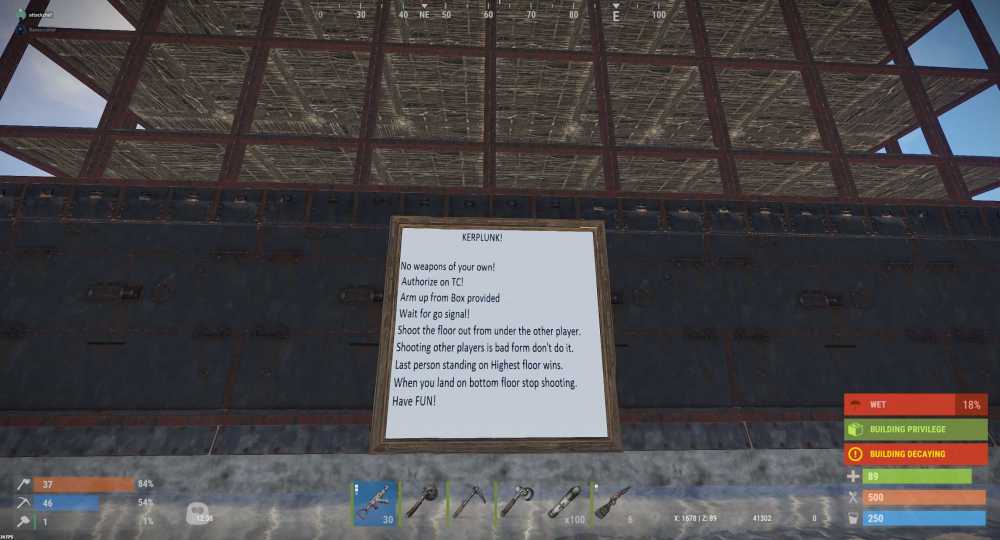 No weapons of your own! Authorize on TC! Arm up from Box provided Wait for go signal! Shoot the floor out from under the other player. Shooting other players is bad form don't do it. Last person standing on Highest floor wins. When you land on bottom floor stop shooting. Have FUN!