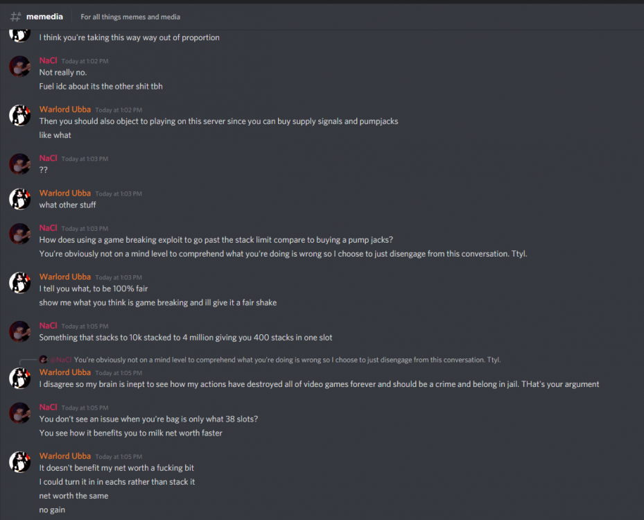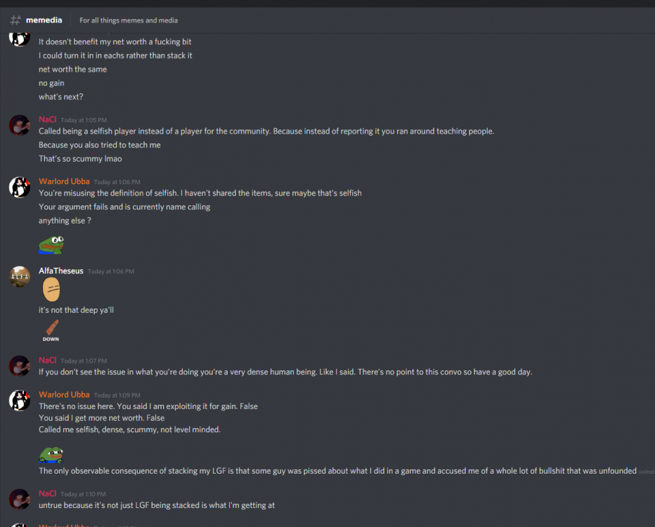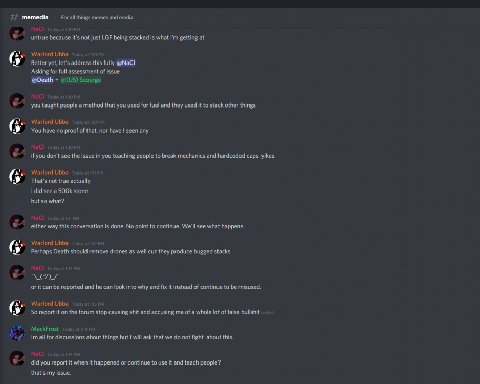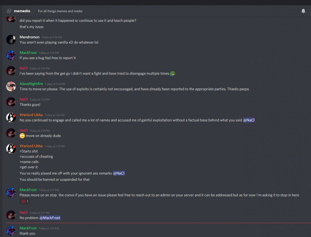 10. Temporary Ban Request on NaCl. Name calling, accusing me of cheating, flaming, instigation and starting issues Discussion occurred on Discord memedia Accused me of cheating Called me scummy, not level minded, accused me of cheating, accused me of gainful exploitation, instigation, flaming. In order 1 2. 3. 4. 5