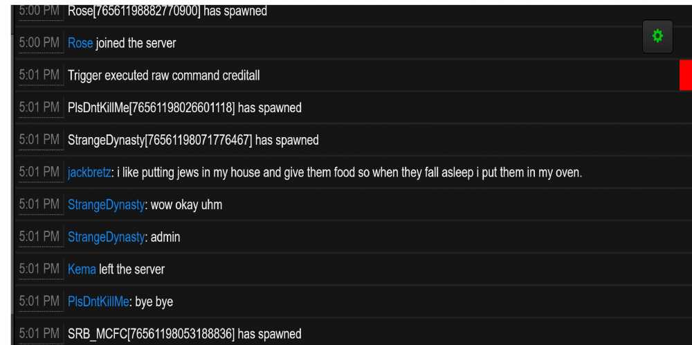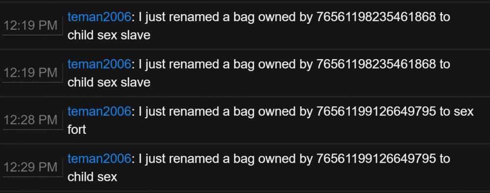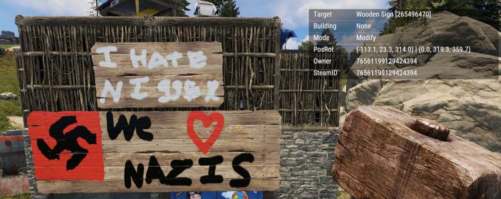 Offender: teman2006 Steam ID: 76561199129424394 Battlemetrics: 980775442 Server: US Survival Time: 0409 AM HST Length: Permanent Reason: Racism and pedophilia. Other: Players posted racist imagery to wooden signs and named sleeping bags in pedophilic manner