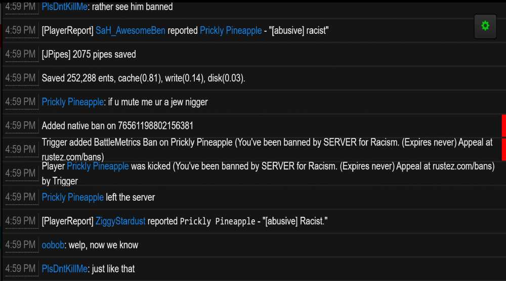 Offender: jackbretz Steam ID: 76561198833562928 Battlemetrics: 843474673 Server: US Survival Time: 17:04 HST Length: Permanent Reason: Racism More Info: Player joined the server and immediately made a racist joke as well as showed solidarity to another player, Prickley Pineapple -450182902 (who'm the server automatically banned moments earlier for their use of racism)