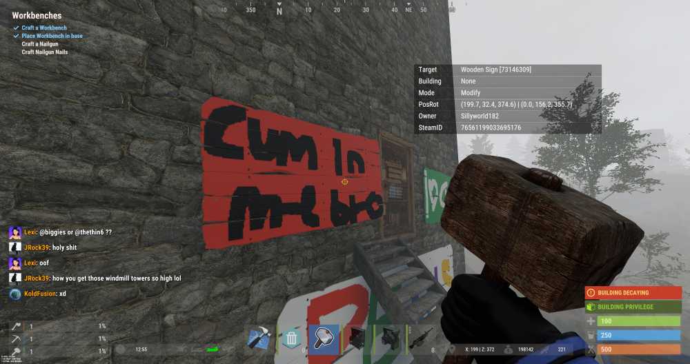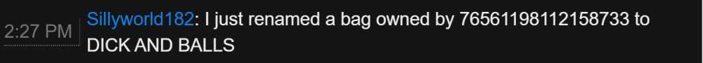 Offender: Sillyworld182 Steam ID: 76561199033695176 Battlemetrics: 978366881 Server: US Survival Time: 12:51 AM HST Length: Permanent Reason: Raiding, Griefing, Indecent signage More Info: Player was able to access to a base and gain access to an unlock TC and proceeded to loot everything. The player then griefed the base with innapropriate signs as well as renamed a sleeping bag owned by another player in a similarly inappropriate manner.