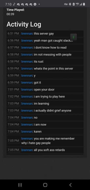 Offender: brennan Steam ID: 76561199068001338 Battlemetrics: 978260074 Server: US Survival Time: 1907 PM HST Length: Permanent Reason: Harassment, feining ignorance, homophobic remarks Other: Player joined the server and harassed other players. Feining ignorance even as other players attempted to remind him of the rules. Player then defamed other players with homophobic and other sensitive remarks.