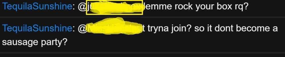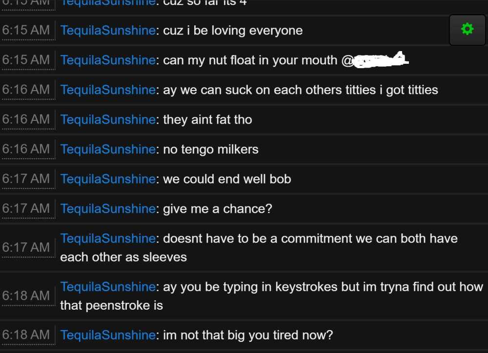 Offender: TequilaSunshine Steam ID: 76561198116109692 Battlemetrics: 241216004 Server: US Survival Time: 06:25 AM AST Length: Permanent Reason: Inappropriate Chat Info: Player was chatting in a very sexually charged manner. Player was asked to stop, but continued chatting with the same lewd banter regardless. Evidence available upon request.